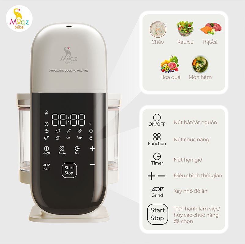 Function: Đây là nút tùy chọn chức năng. Bố mẹ nhấn vào nút này để chọn lần lượt chế độ hoạt động, bao gồm: Cháo/bột; Khoai tây, rau củ, trái cây, thịt, cá; Các món tùy ý (DIY); Tổ yến; Món hầm.